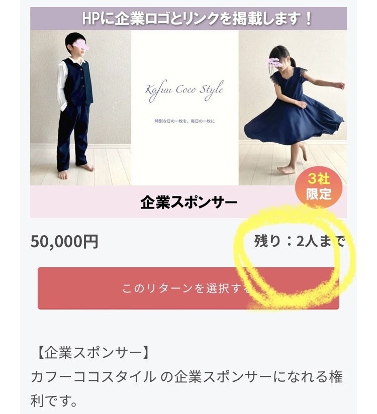 カフーココスタイルのHP(ECサイト予定)に、スポンサーとして、貴社のロゴを掲載させて頂く形のリターンです。