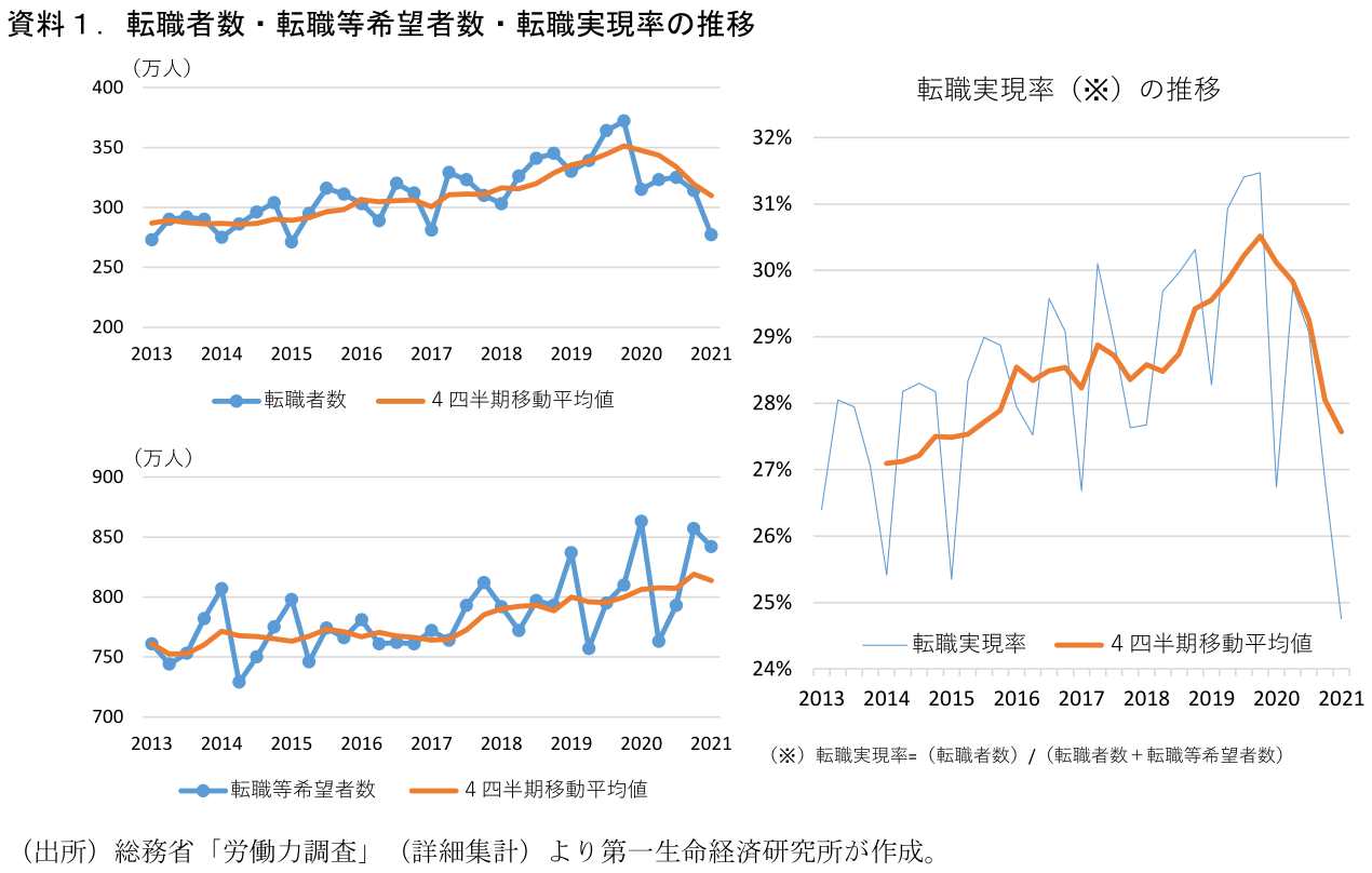 このデータによると、2020年4月~2021年3月の1年で実際に転職した人は約1,300万人でした。(四半期累計)