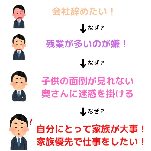一般的に、「なぜ?」を3回繰り返すと自分の本心が見えてくると言われています。
