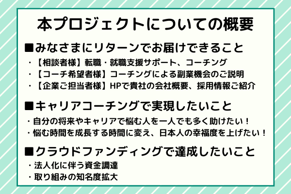 ボランティアだったキャリアコーチングの取り組みを法人化し、より深く、より多くの相談者の方々をサポートできる体制を作るべく、今回の法人化プロジェクト立ち上げに至りました。