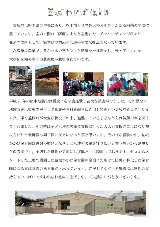 ”遊び心のある災害対策保育園”って、具体的にどんな風になるのか気になりますよね。今回、その第一号のモデル保育園となっていただくのが、熊本県にある益城わかば保育園。平成28年に起きた熊本地震では大変な被害に遭われた益城町にある保育園です。その経験から、今回の災害対策保育園モデル第1号となっていただくことになりました。園より今回の取り組みに際してコメントをいただきましたので、ぜひご覧ください。