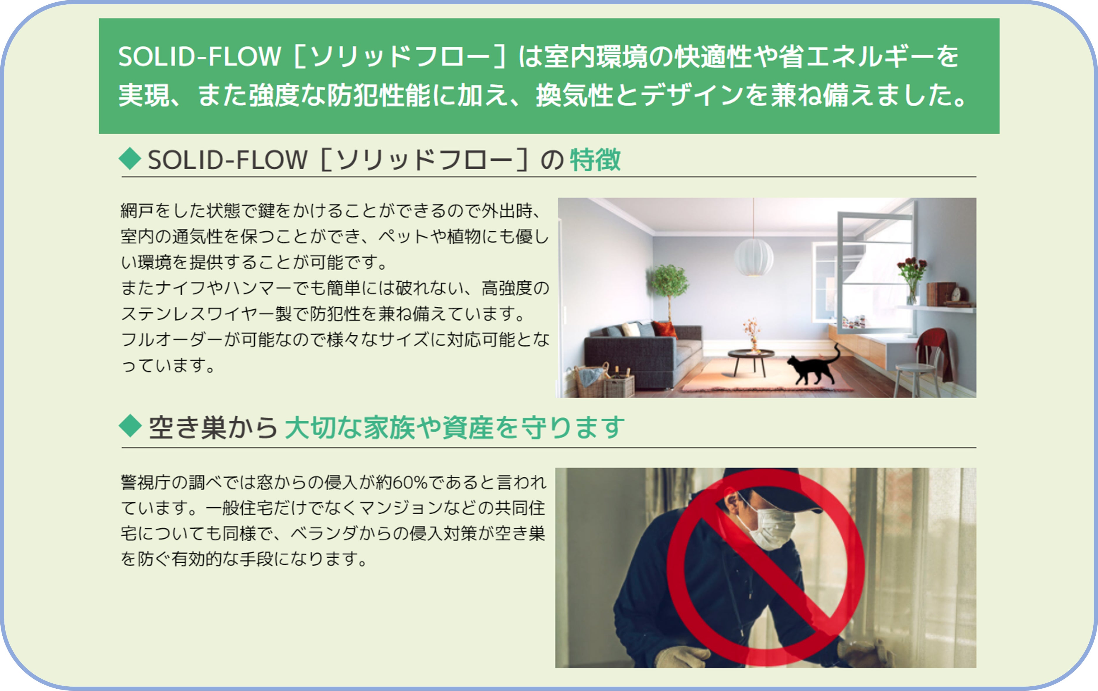 破れない網戸『ソリッドフロー』は、高強度ステンレスワイヤー製の網を使用し、鍵もついている、破れない、防犯機能がある網戸です。新型コロナ感染症対策のために換気をする際、安心して窓を開けておくことができるのに加え、耐久性があり張替えも不要ですので、保育園に設置するのに最適です。