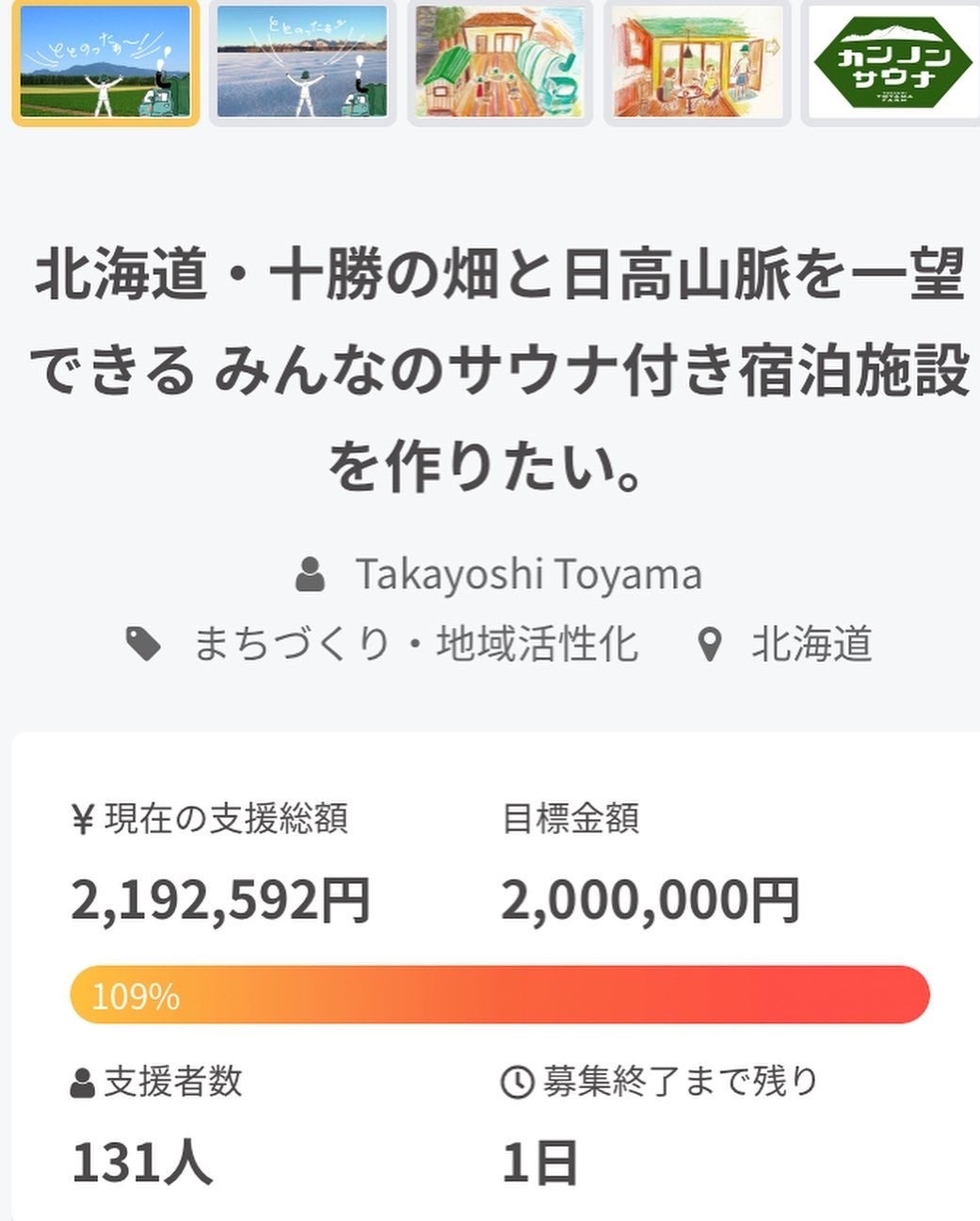 おかげさまで3月3日にサウナ付き宿泊施設 建設のためのクラウドファンディングの目標金額200万円を達成することができました!