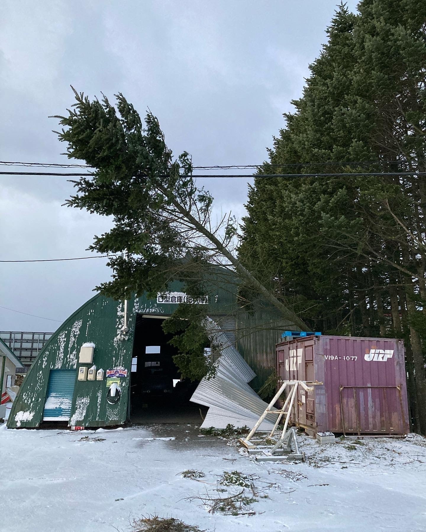 先日(先月)日高山脈の南西部を中心に推測25〜30m/hの暴風が発生し、わずか数時間の間に農村部の多くの家屋、納屋、ビニールハウスなどが破損する被害がありました。当農場でも倉庫3棟が損壊する被害を受けてしまいました。