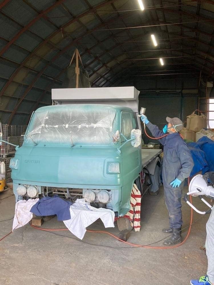 ということで、現役を引退したファームマシーンを活用して、1970年代の十勝の農場シーンを復刻させたサウナを作るプロジェクトが始動しました。主役は1976年製で十勝の多くの農場で活躍した名車「三菱ふそうキャンター(積載量2トン)」愛称はVキャンター。
