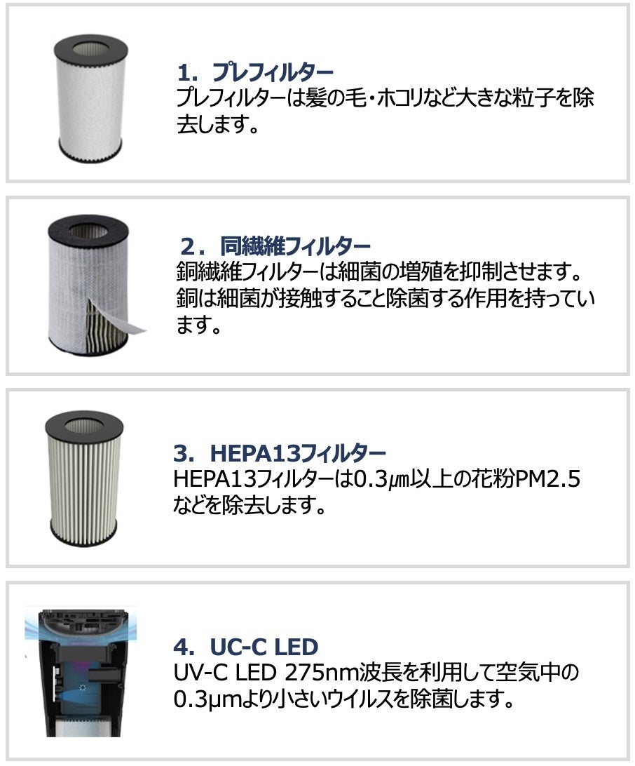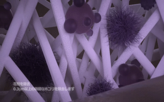 ・HEPA 13フィルター:0.3μm以上の花粉や細菌・微細なホコリを除去