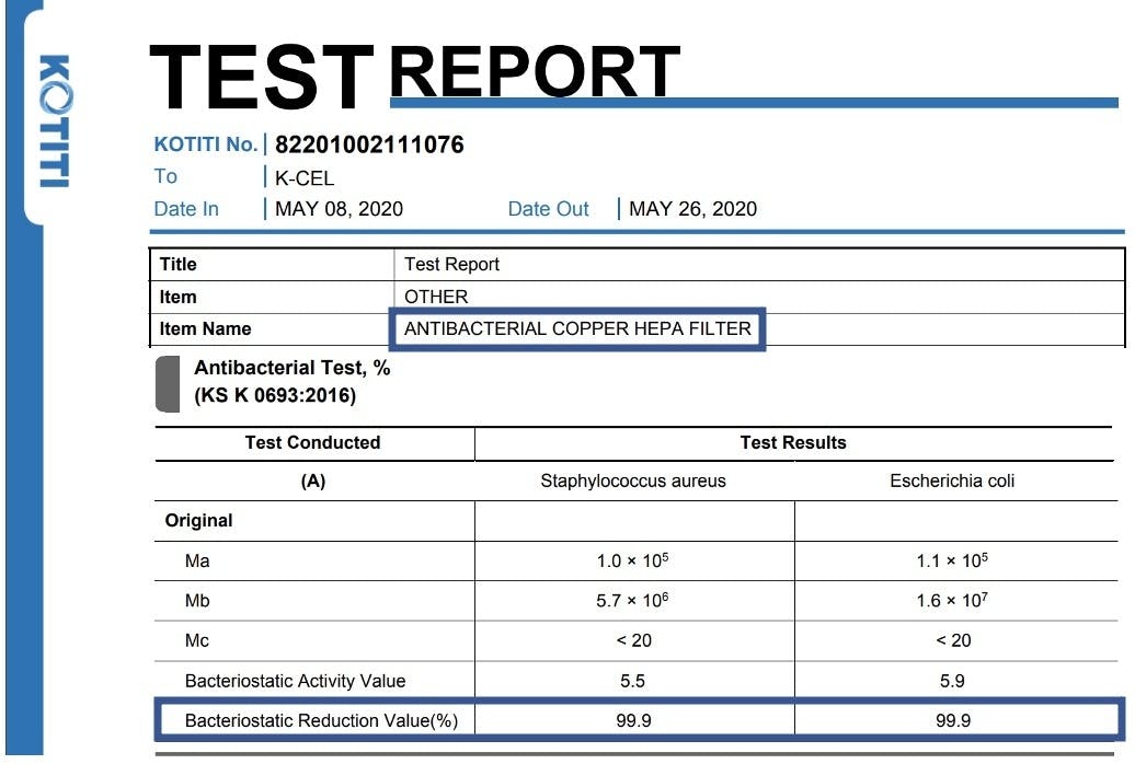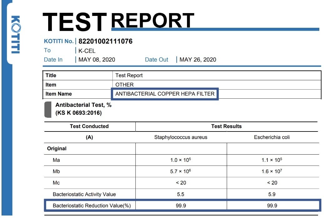 ・検査結果:銅繊維フィルターとノーマルフィルターで絡め取った細菌の増殖テストを実施。ノーマルは20%の減少に留まったことに対し、銅繊維は99.9%が減少し、その有効性を確認