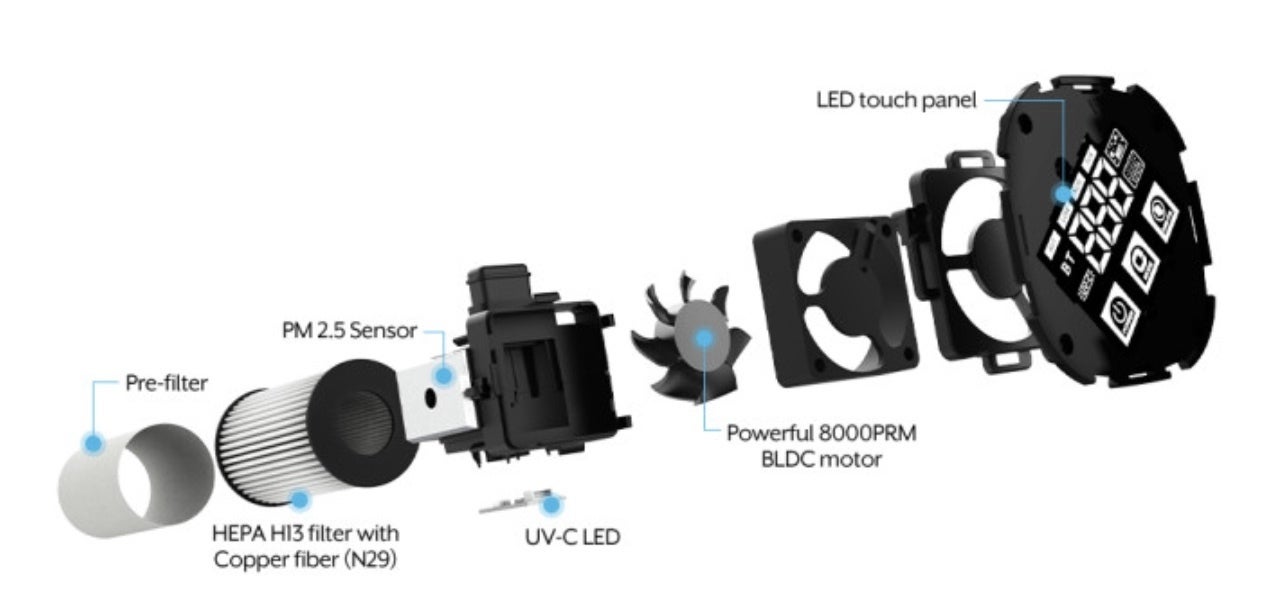 結果、除菌効果に優れたUV-C LED10mWを空気清浄機に採用して、銅繊維のHEPA H13フィルターも取り入れ、センサーも日本製造会社のPM2.5センサーを使用しすることでLEDタッチ感を良くし、風向からムード灯が見えるよう、デザインにも工夫を凝らしました。