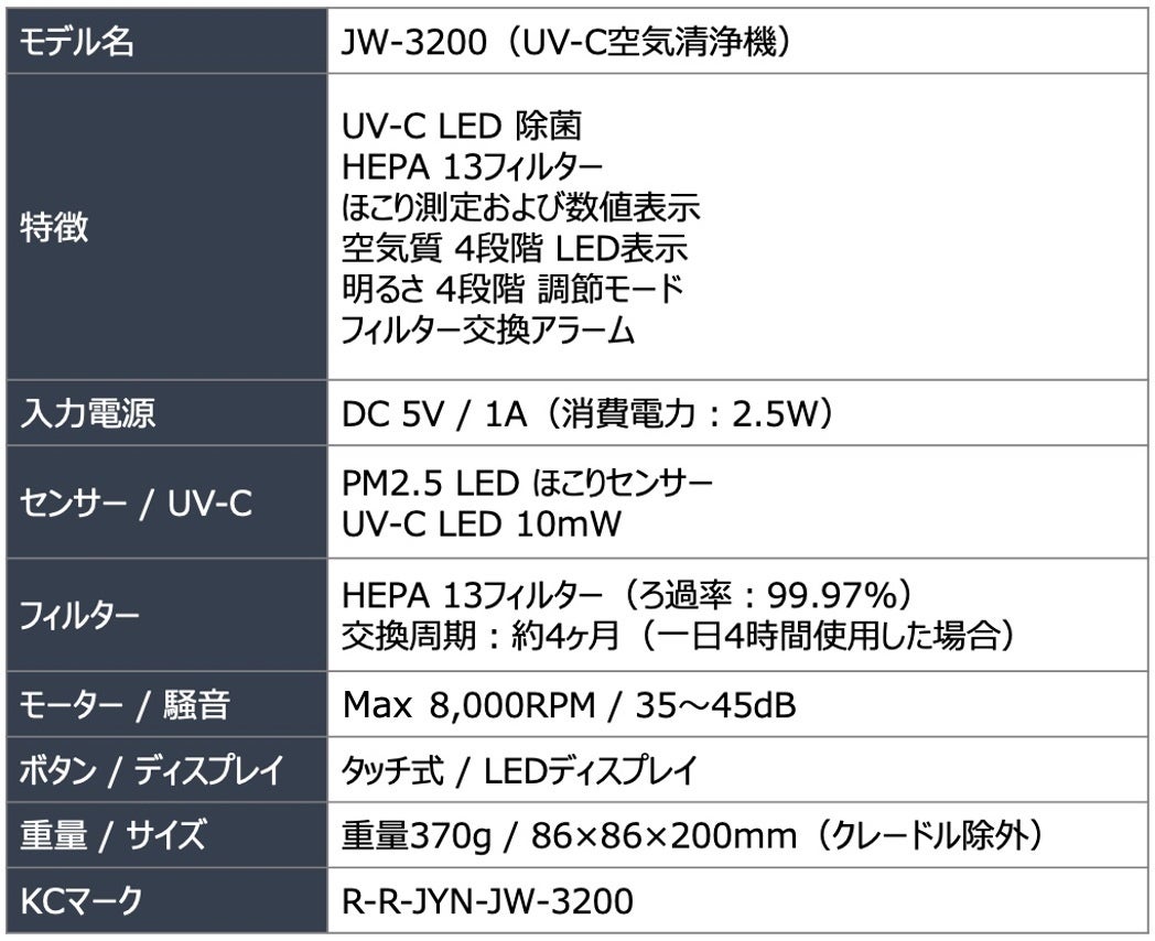 A. 空気中の除菌とは、空気清浄機を介し継続的に空気が循環され、ホコリや花粉などの汚れをフィルターでろ過し、PM2.5より小さいウイルスはUV-Cによって除去してウイルスきれいな空気を排出することができます。本製品はUV-C LED 10mW 275mm波長帯を使用します。