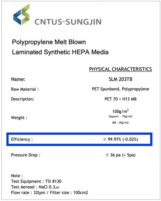 ・証明内容:当該HEPA 13フィルターは0.3μm以上の粉塵を99.97%除去