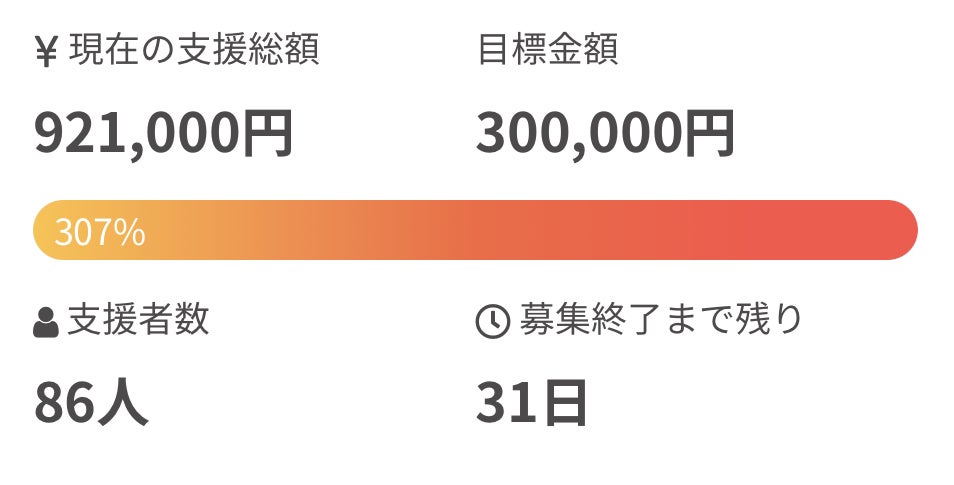 皆様からの多大なご支援をいただきまして、目標金額の300%を達成することができました!