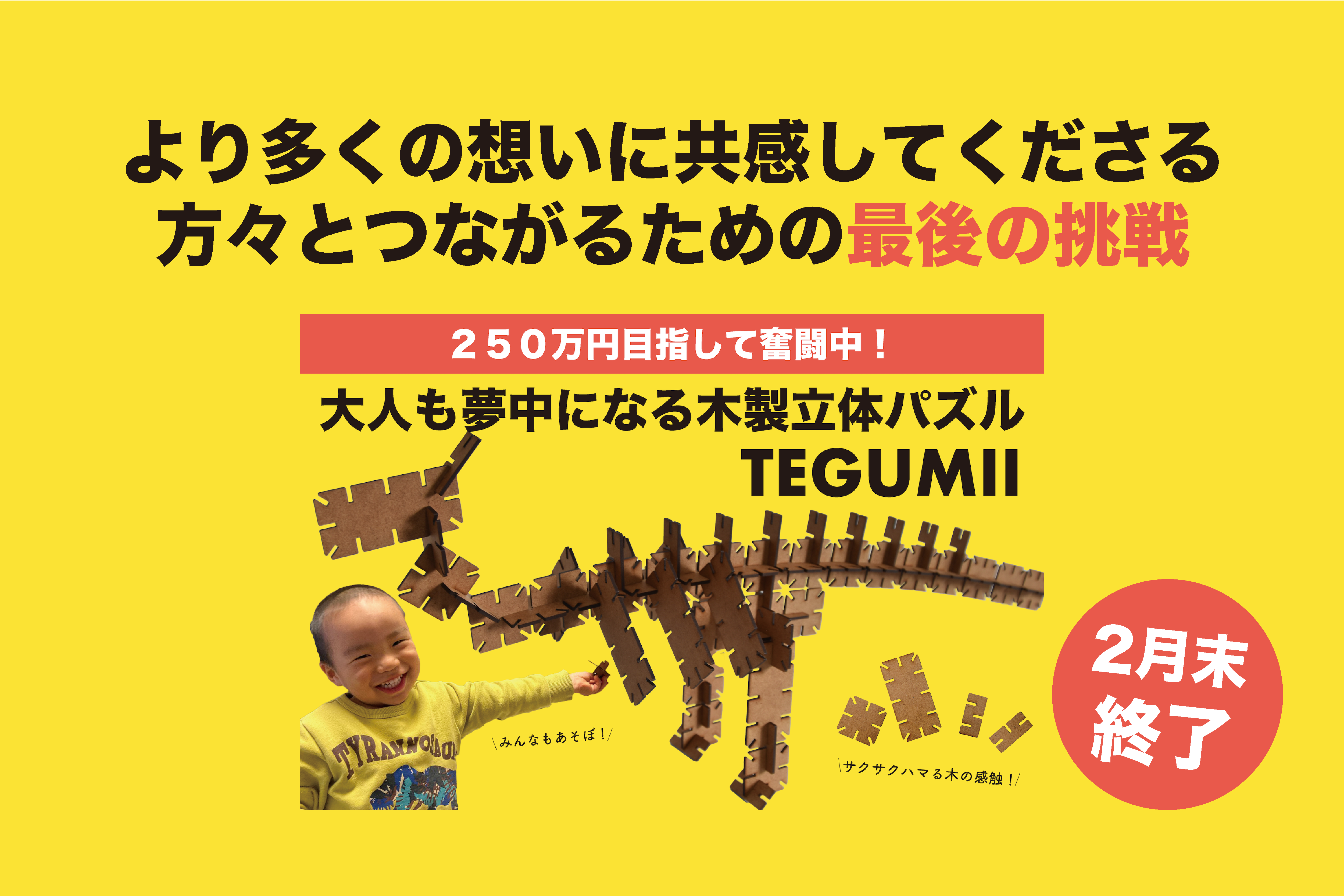 皆様こんにちは。テグミープロジェクトの村松美穂(むらまつみほ)・越川光(こしかわひかる)です。皆様からの多大なご支援をいただきまして、2月8日にストレッチゴールである150万円を達成することができました!たくさんのご支援ありがとうございます。ストレッチゴールを達成したことで、テグミーを自社で生産する初期設備を導入できるようになりました!設備を導入した際には活動報告にて、皆様にご報告させていただきます。本プロジェクトを通して、多くの方にテグミーに込めた想いに共感していただいていることを日々感じております。「子どもと遊びたくなりました!」「孫にプレゼントして遊びます!」「楽しみに到着を待っています。」と多くの声援をいただきまして、改めて身を引き締めております。そして、テグミーをさらに日本中に広めていくために、わたし達は本プロジェクトにおける最終目標(2,500,000円)を設定することにしました!これが最後の挑戦です。ファイナルゴールを達成することで、最後まで想いに共感してくださる方々とよりたくさんつながり、テグミーを広げていきたいと考えています。いただいたご支援を決して無駄にせず、テグミーを世代や国籍にかかわらず、創造を楽しみ人とつながるツールにするという目標に向けて邁進して参ります。最終日である2月28日まで走り続け、皆様にリターンをお届けできる日を楽しみにしています!引き続きよろしくお願いいたします。村松美穂(むらまつみほ)・越川光(こしかわひかる)