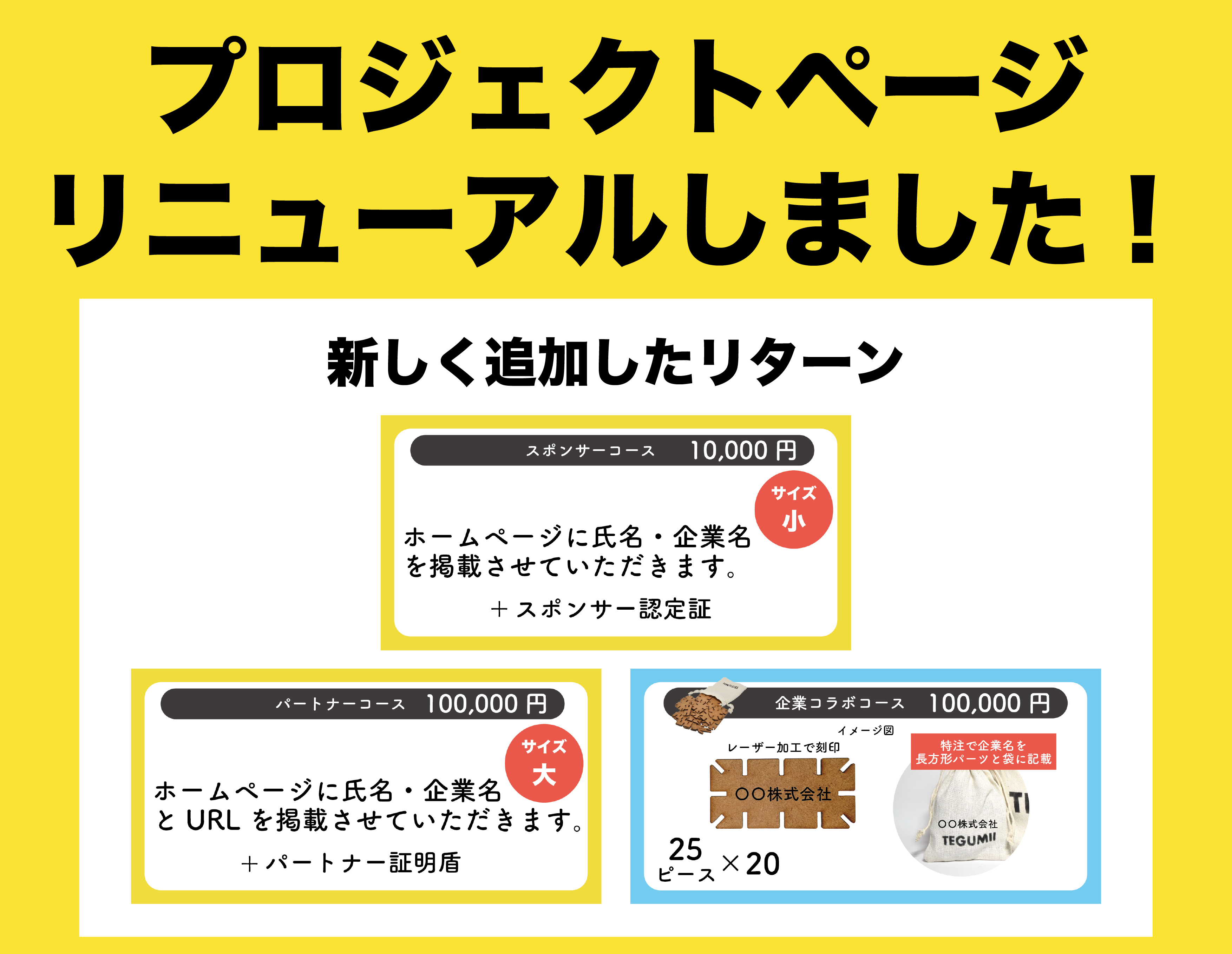 皆様おはようございます。テグミープロジェクトの村松美穂(むらまつみほ)・越川光(こしかわひかる)です。先日の活動報告でお伝えしましたストレッチゴールについて、プロジェクトページをリニューアルいたしましたのでご報告させていただきます。プロジェクトページでは、ストレッチゴールに挑戦する想いと、達成することでわたし達が何を実現できるのかについて述べさせていただきました。それに伴い、3種類のリターンを新しく追加いたしました。コース名は以下の通りです。・スポンサーコース・パートナーコース・企業コラボコース詳細はプロジェクトページを見ていただけると嬉しいです。================================クラウドファンディングの開始から4日目になりました。テグミーのプロジェクトはこれから中盤戦に突入します。中盤は支援や注目が集まりにくく、苦労する期間と言われております。わたし達にとっても初めての体験で、中盤でも多くの方々にテグミーを知っていただくにはどうするべきなのか創意工夫する毎日です。そんな中でTwitterなどで活動報告や支援したことをシェアしていただくと、わたし達では届かない方々にもテグミーを知っていただける機会につながります。そこで皆様にも今一度、FacebookやTwitter等のSNSでの拡散にご協力いただけると嬉しいです。今後ともよろしくお願いいたします。村松美穂(むらまつみほ)・越川光(こしかわひかる)
