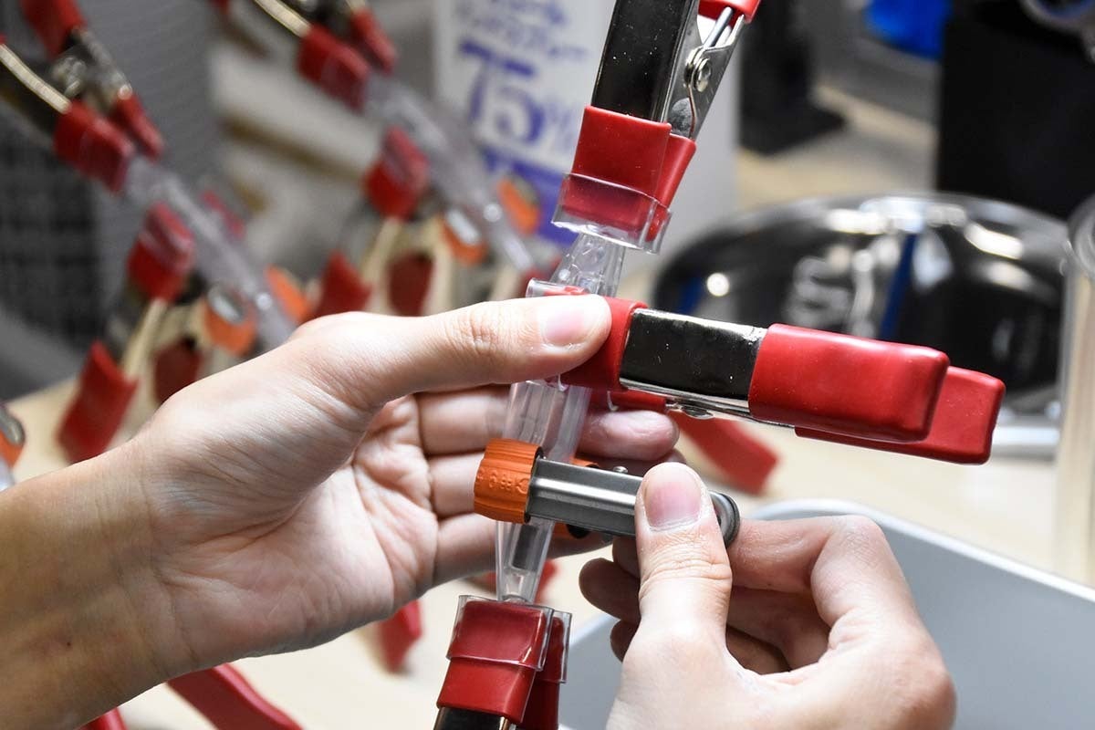 成型されたボディパーツと重り、エイト菅、磁石を組み立て接着します。浸水テストを行い、内部に水が入らないかを確認します。