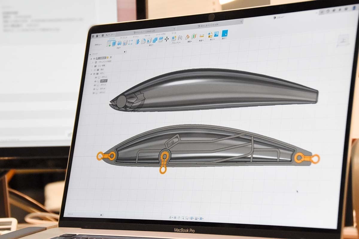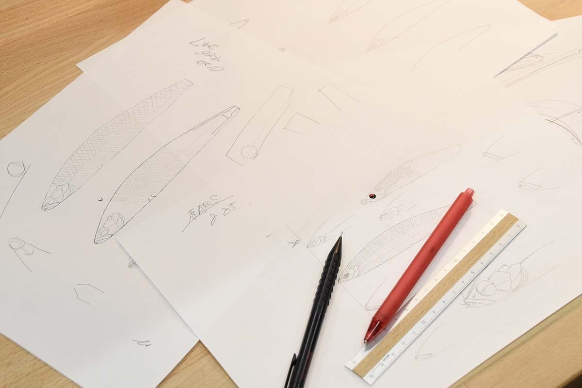 フリーハンドでルアーの形やエラの模様を頭の中のイメージ通りに書き出します。エラの凹凸やエイト環の溝、ルアーの厚みなども詳細に書き出します。