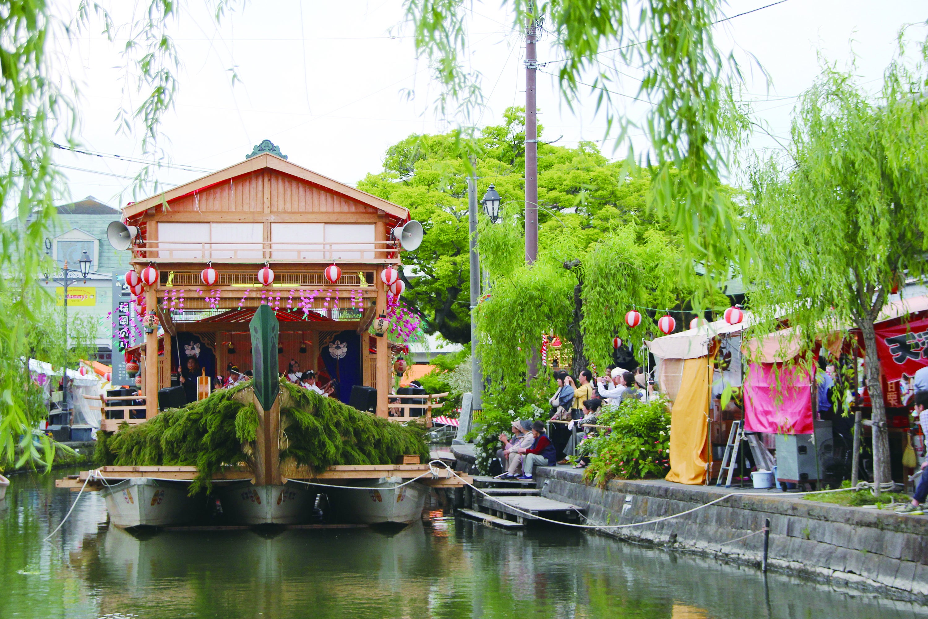 沖端水天宮祭り…5月の3連休、掘割沿いに露店が所狭しと並び、日夜多くの人で賑わいます。掘割には、大きな舟舞台「三神丸」が置かれ、地元民によるお囃子が演奏奉納されます。「三神丸」は、6艘の小舟の上に作られる大きさで、地元青年や宮大工を中心に、毎年作っています。