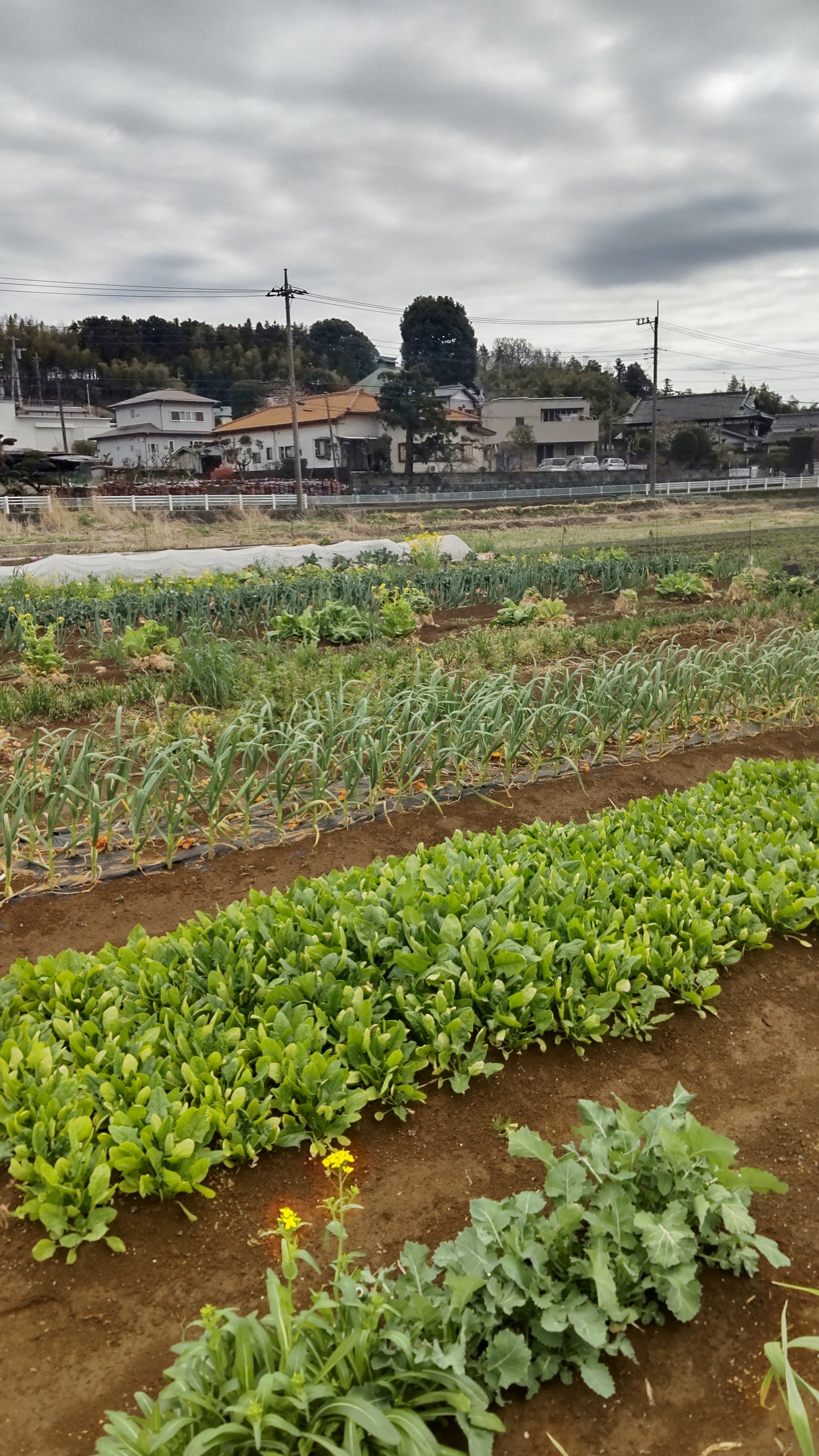 ホウレンソウ、ネギ、白菜、にんにく等のお野菜たちが育っています。