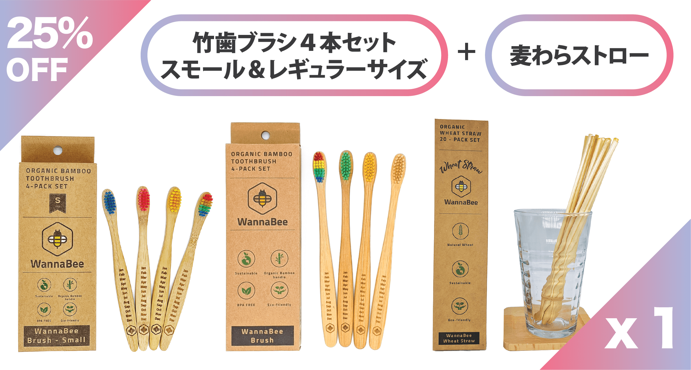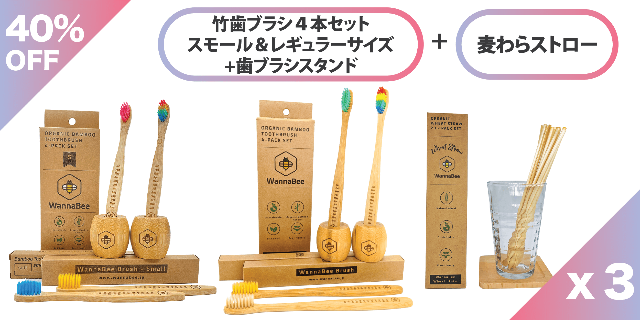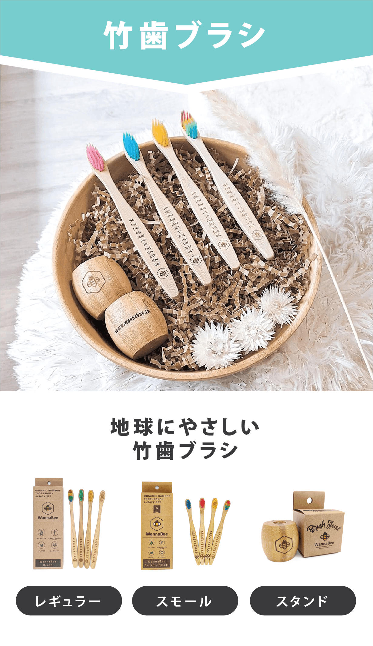 竹は繁殖力と成長スピードが他の植物と比較すると群を抜いて早いと言われています。WannaBee竹歯ブラシは孟宗竹(モウソウチク)という竹で作られた歯ブラシです。ブラシ部分には、ヴィーガンの観点から動物の毛を使用せず有害な物質を含まない「BPAフリー」のナイロンを使用しています。一般的に使われているプラスチック製の歯ブラシは、分解されるまでに400年以上がかかり、1年間に廃棄される数はおよそ36億本にもなると言われています。
