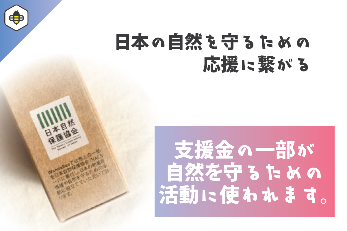 WannaBeeでは製品売上の一部を「公益財団法人日本自然保護協会」(NACS-J)へ寄付し、日本の絶滅危惧種や自然を守るための活動に役立てていただく予定です。私たちの活動にご賛同・ご支援いただける皆様の想いと共に届けていきます。