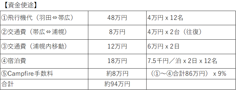 みなさんからいただいたご支援は、3月の浦幌町合宿のために、以下のように大切につかわせていただきます。