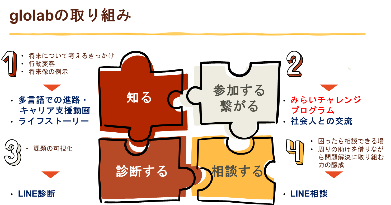 glolabは、外国にルーツを持つ若者が社会的、経済的に自立できることを目指し、キャリア教育とコミュニティ創出事業を行っている特定非営利法人です。glolabという名前は、“global” + “lab”(グローバルな人になるための実験室)からきています。逆境を成長機会にして、自発的にチャレンジし学んでいくことで成長(grow)してほしい、という想いが込められています。外国ルーツ青少年の支援経験から関わるようになった人もいれば、私みたいな「元」外国ルーツ青少年のスタッフもいます。進路選択をサポートする!という目標からアイデアがうまれ、支援者と当事者両方の視点を合わせてできたのが、このプログラムの特徴でもあります。