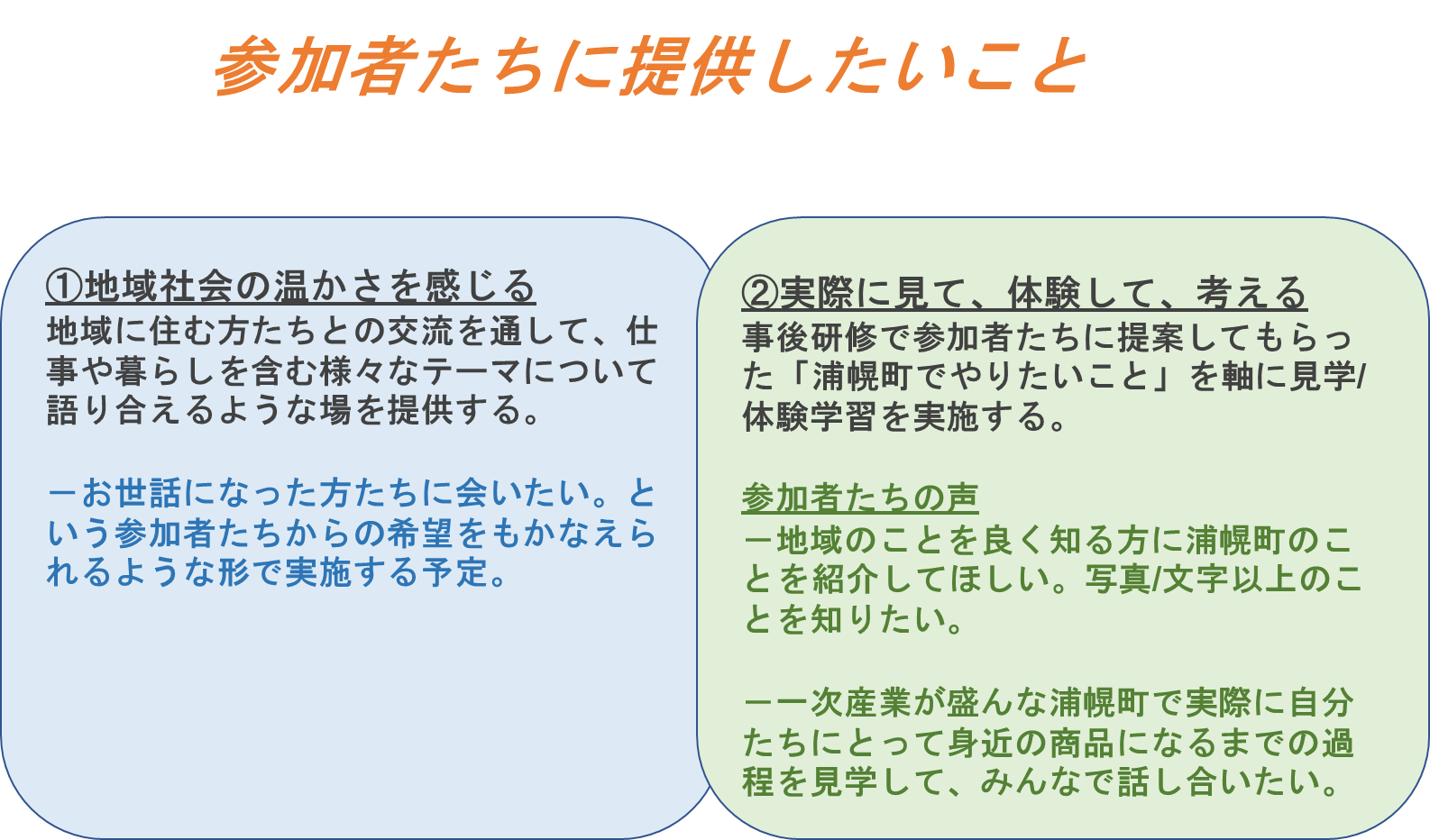 特に②の部分は、実際に事後学習で参加者がグループワークを通して、自分たちがやりたいことを具体的な内容に加え背景と目的をも考えてもらって、提案したモノがベースになっています。