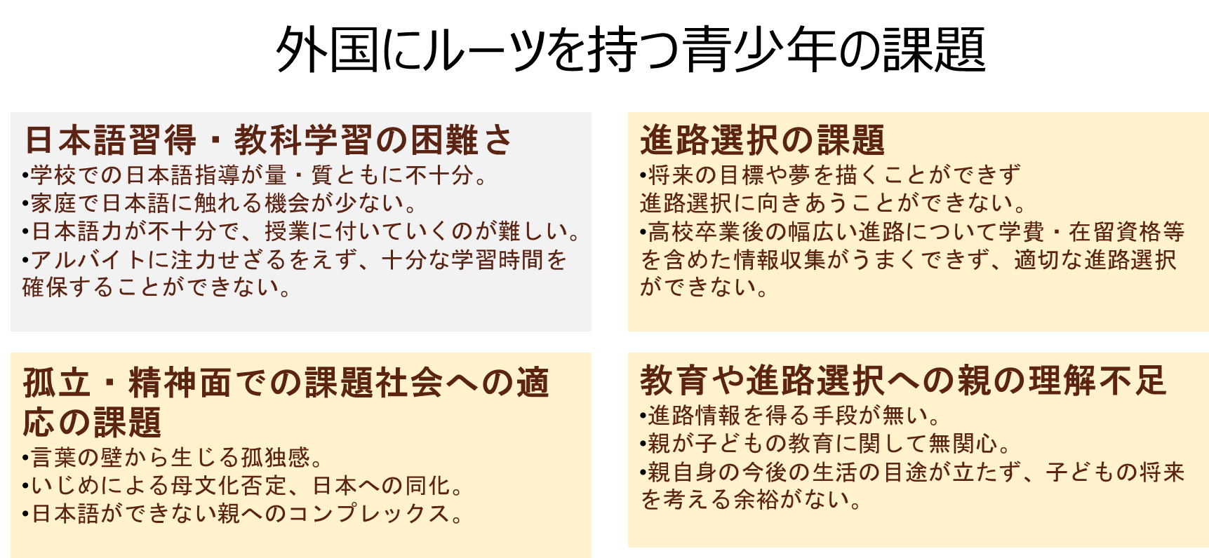 多くの外国ルーツの子どもたちは、親世代の選択で「日本」という環境に暮らしています。そして、言語、教育システムや社会環境などの様々な壁によって選択肢が狭められたり、見えなくなっていたりしています。人生の大きな分岐点である高校以降の進路選択もそうです。