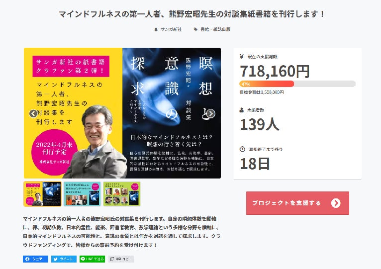 『瞑想と意識の探求』事前予約クラウドファンディングに139人の方にご支援いただき、71万円を超える金額となりました。ありがとうございます。冊数で144冊です。
