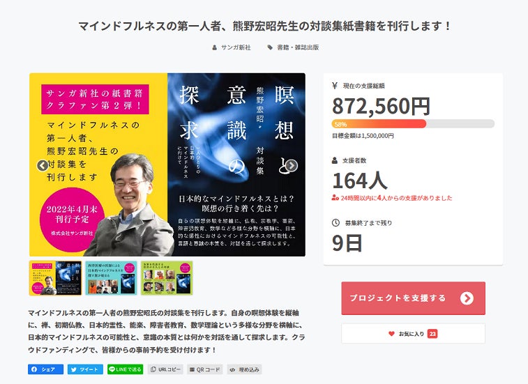 『瞑想と意識の探求』事前予約クラウドファンディングに164人の方にご支援いただき、87万円を超える金額となりました。ありがとうございます。冊数で162冊です。