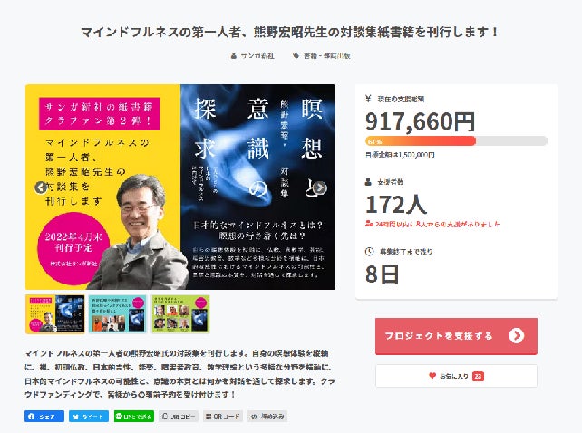 『瞑想と意識の探求』事前予約クラウドファンディングに172人の方にご支援いただき、91万円を超える金額となりました。ありがとうございます。冊数で183冊です。