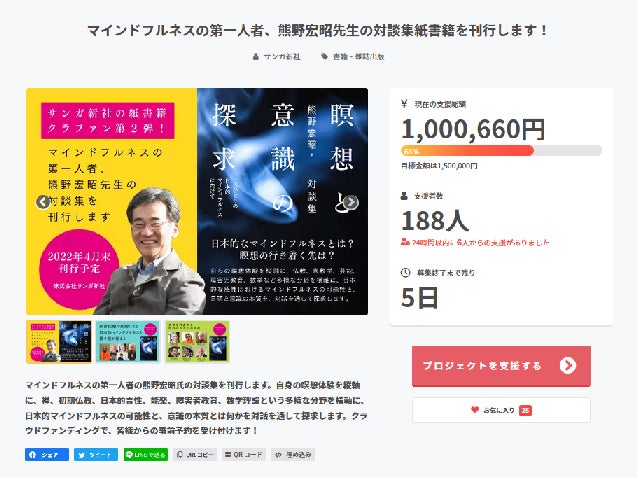 『瞑想と意識の探求』事前予約クラウドファンディングに188人の方にご支援いただき、100万円を超える金額となりました。本当に、ありがとうございます! 冊数で199冊です!