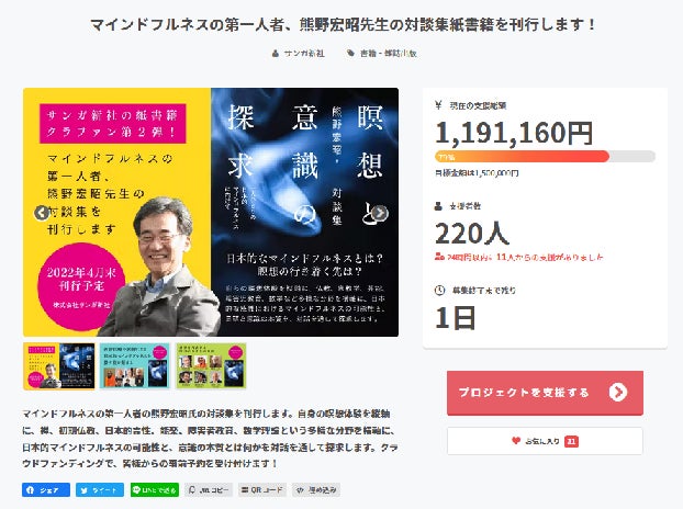 『瞑想と意識の探求』事前予約クラウドファンディングに220人の方にご支援いただき、119万円を超える金額となりました。ありがとうございます。冊数で230冊のご予約をいただきました! 今日を含めあと2日です。最後までよろしくお願いいたします。
