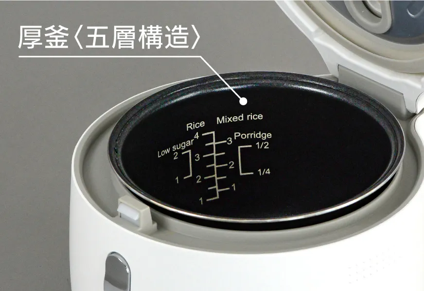 ローシュガーライスミニの釜は鍛金技法で作られた分厚い五層構造。
