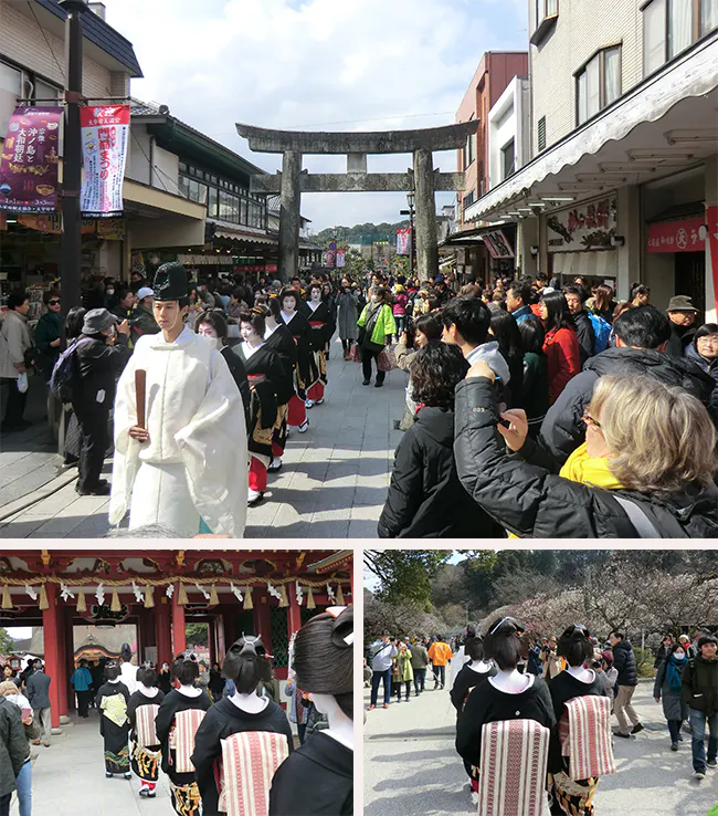 梅の花満開のこの季節、黒紋付に博多献上帯姿の艷やかな博多芸妓衆が太宰府参道から天満宮を練り歩き、九州国立博物館で唄と踊りを披露します。