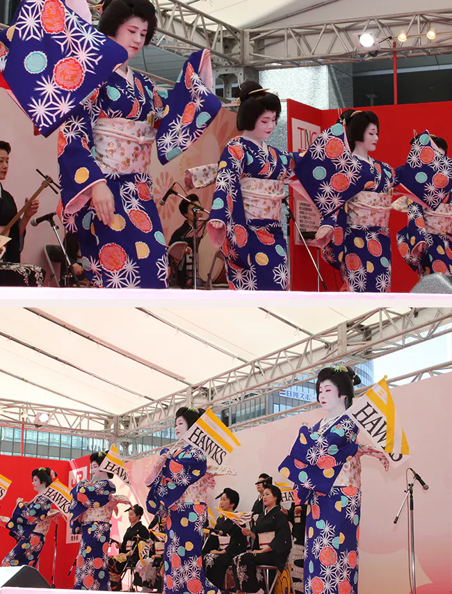 また、2019年に行われた「G20福岡歓迎レセプション」や毎年行われる「博多どんたく港まつり」で「伎芸」をご披露させて頂くなど、普段の酒席でのお仕事に加えて、伝統文化を今に伝える役割も担っております。