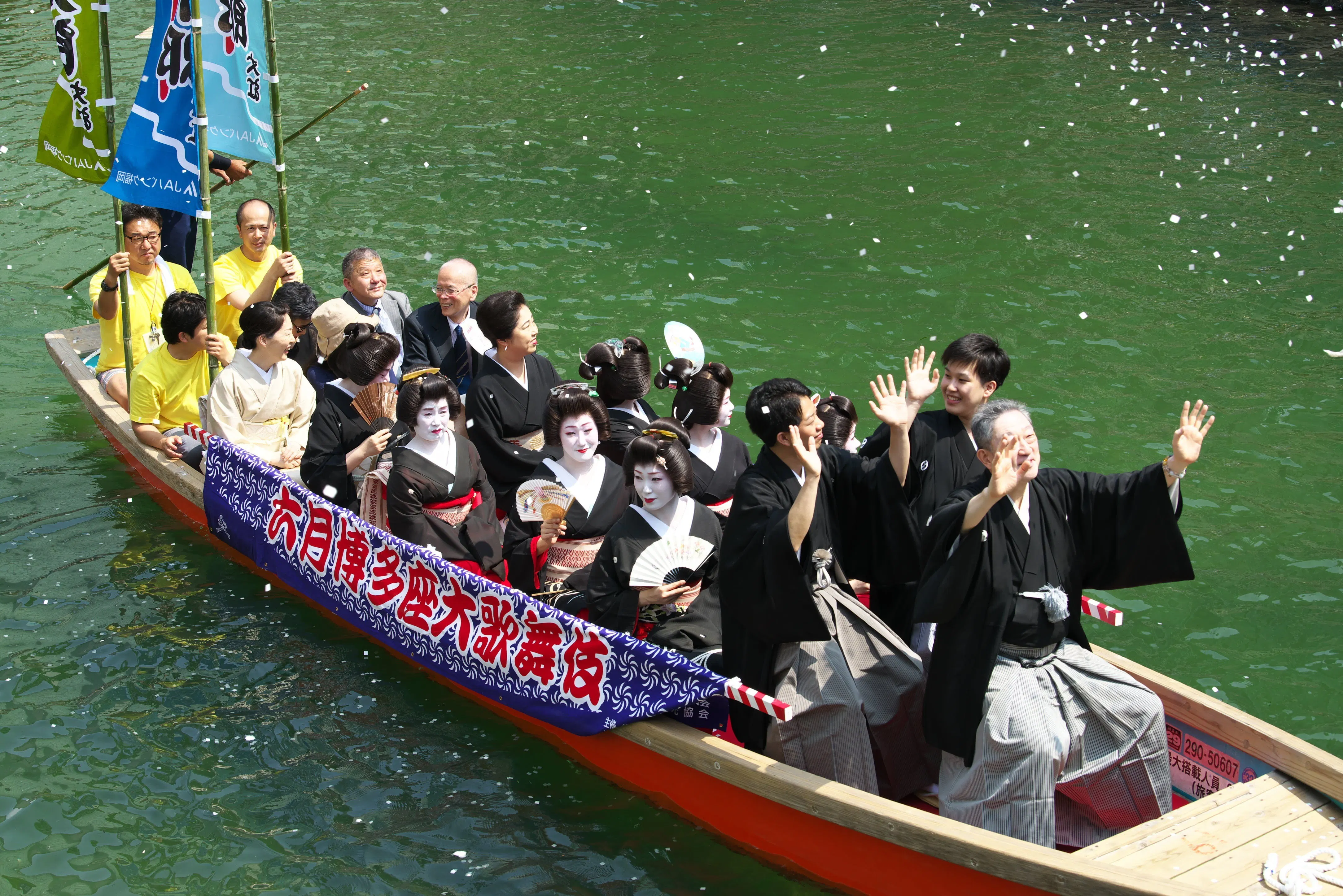 博多では、『六月博多座大歌舞伎』の出演者らが数隻の船に乗り込み、中洲の清流公園を出発し、川端ぜんざい広場で口上を述べられた後、博多リバレインに向かいます。