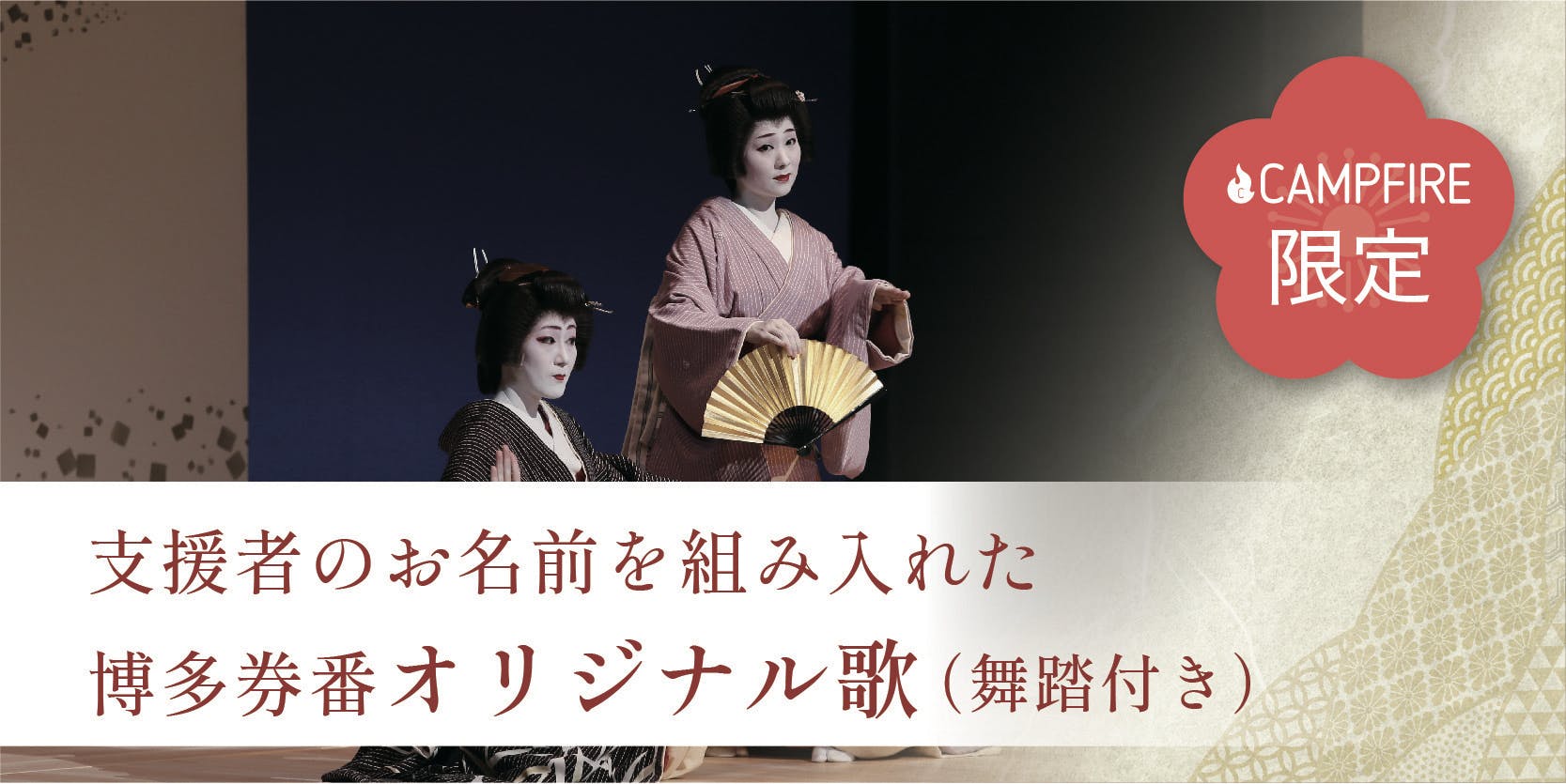 この度、各方面の方々のお力をお借りして博多券番としてクラウドファンディングをさせて頂くことになりました。沢山の方に博多芸妓を知って頂く機会をつくり、また、芸妓文化の継承にご支援を賜りたいと思っております。お力を貸して頂ければ幸いに存じます。私どもも芸を磨き、皆様方にひとときの安らぎを味わって頂ければと精進いたします。