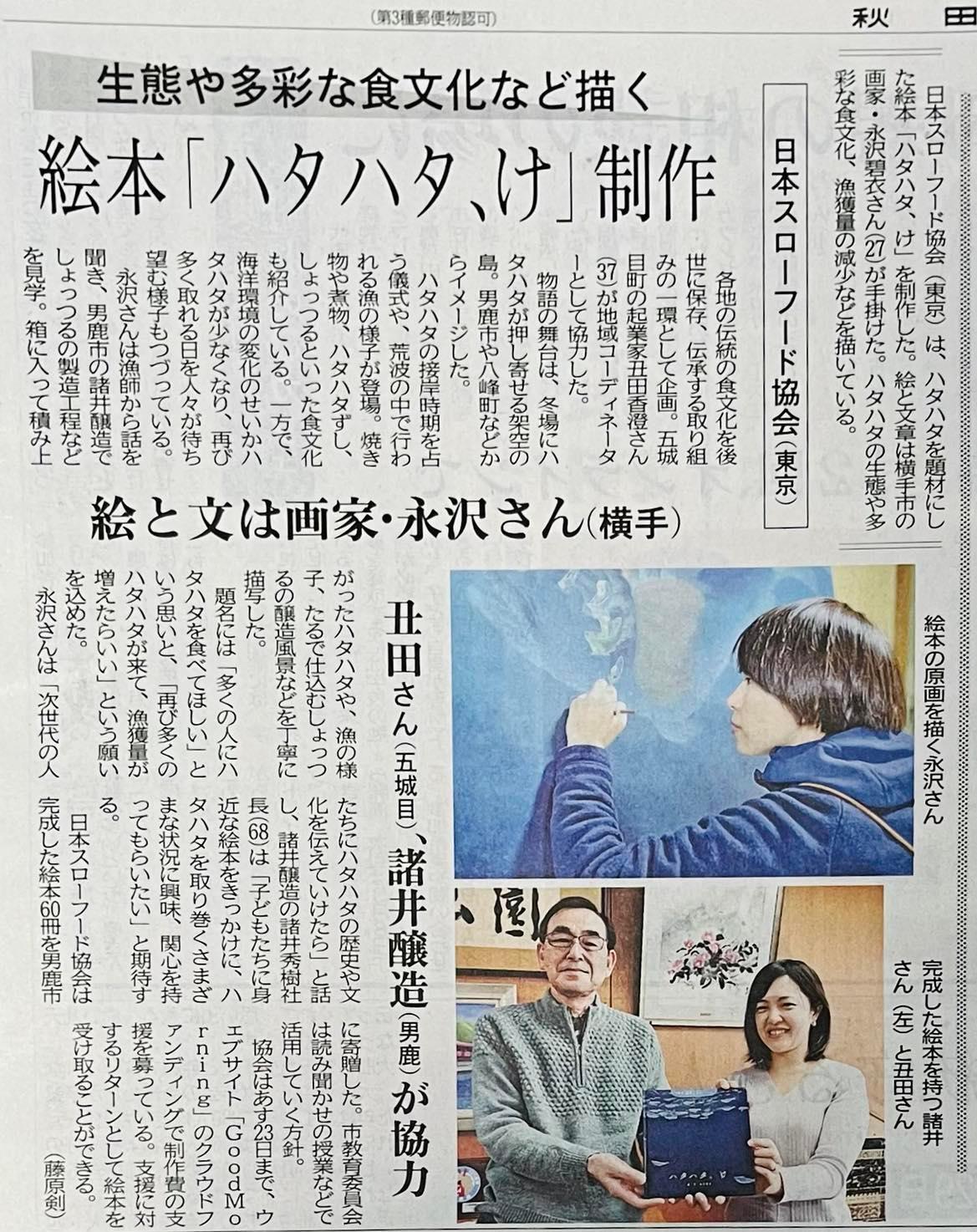 本日、秋田の地元紙 秋田魁新報に 絵本に関する記事が掲載されました!