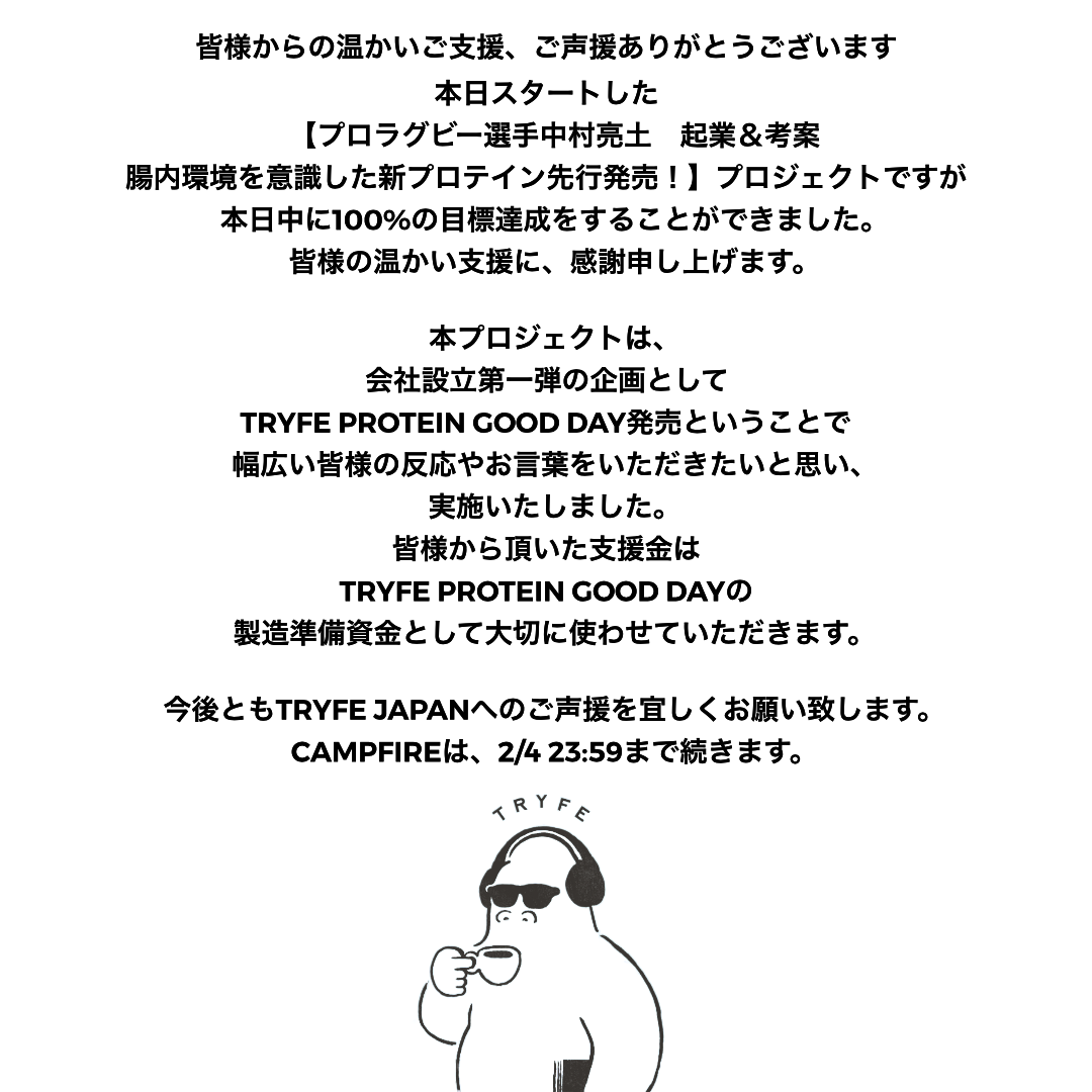 日頃よりご支援ご声援ありがとうございます。本日、CAMPFIRE 設定ゴールを400%に到達致しました。ご支援ありがとうございます!皆様の周りにプロテインに悩まれている方がいましたら是非お知らせいただけると嬉しいです!いま海外では、プロテイン×コーヒーがブームになっていますので、TRYFE PROTEIN GOOD DAYもピッタリです。砂糖不使用、着色料ゼロ、香料ゼロ、保存料ゼロ普通のプロテインとは違い、製作の段階から味にもこだわっています。①砂糖なしでも美味しく仕上がる②お好みでミルクも調節できる TRYFE JAPAN公式ラインアカウントはこちらです。お得な情報を配信していきます。→→→ https://step.lme.jp/landing-qr/1656677311-dBNQGVPg?uLand=5UFxTZ2022年2月4日まで先行発売は継続させていただきます。CAMPFIRE 掲載期間【2021年12月30日 12:00〜2022年2月4日23:59】