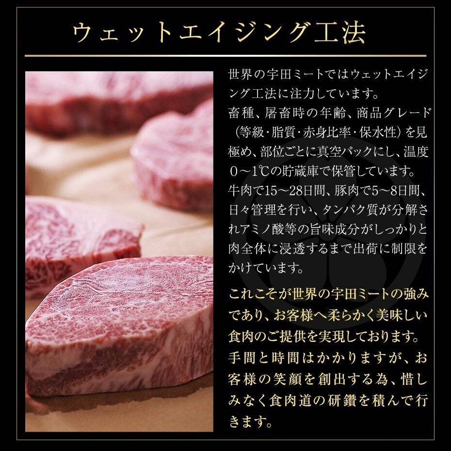 宇田ミートでは、独自の熟成工法「ウェットエイジング工法」を用いています。工法の詳細については、下記をご覧ください。
