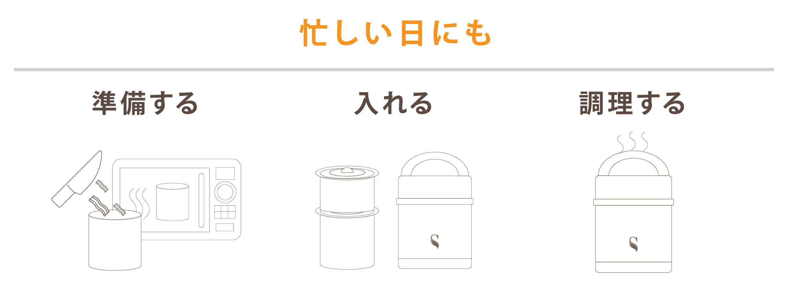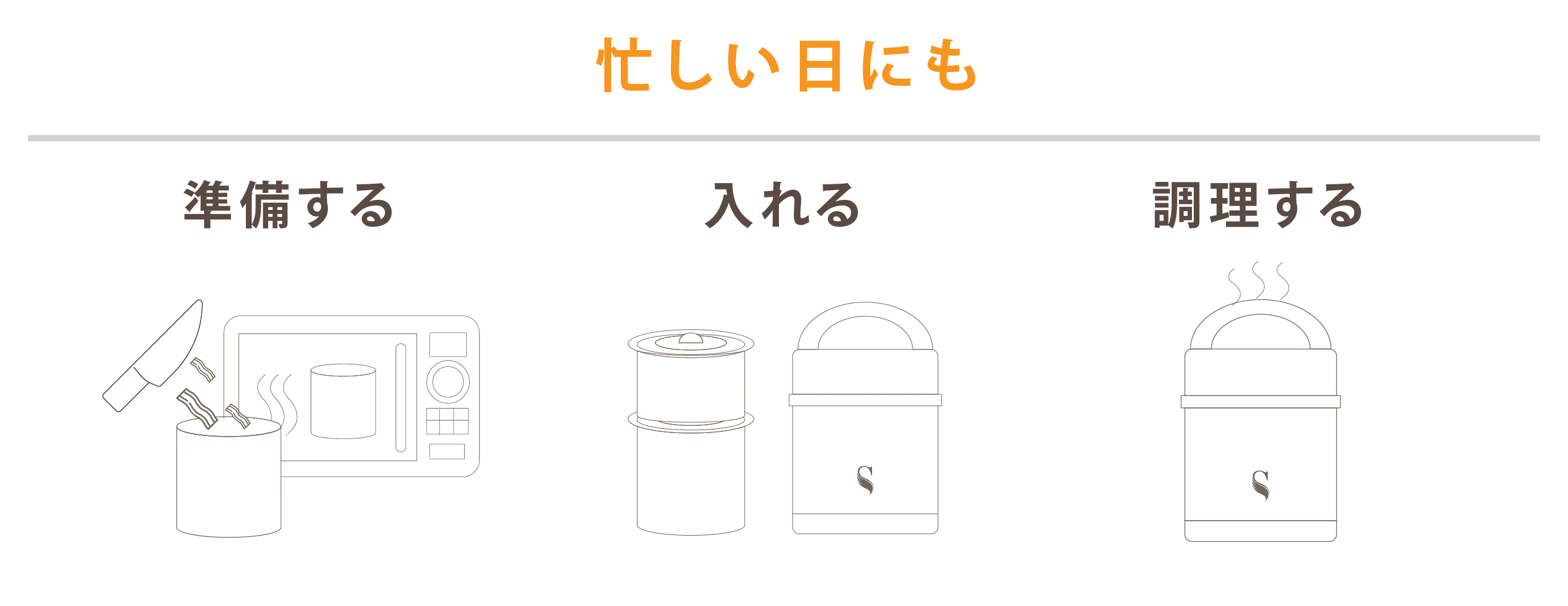 磁器製容器の中に食べ物を入れて、電子レンジで調理します*。一度に数種類の食べ物を重ねてレンジで調理することも可能です。食べ物から出る熱が真空断熱容器内を循環し、余熱で調理を継続したり、保温したりします。