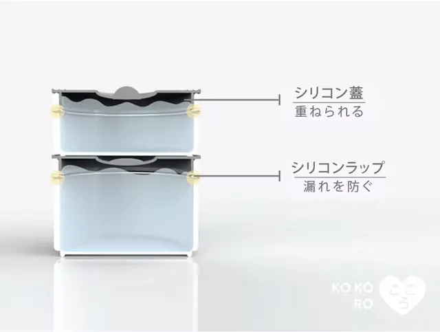 多機能なシリコン製の蓋で、漏れを防ぎます。重ねて使用でき、すべてのKOKORO磁器容器に使用できます。蓋をして冷蔵庫で保管でき、電子レンジ対応です。