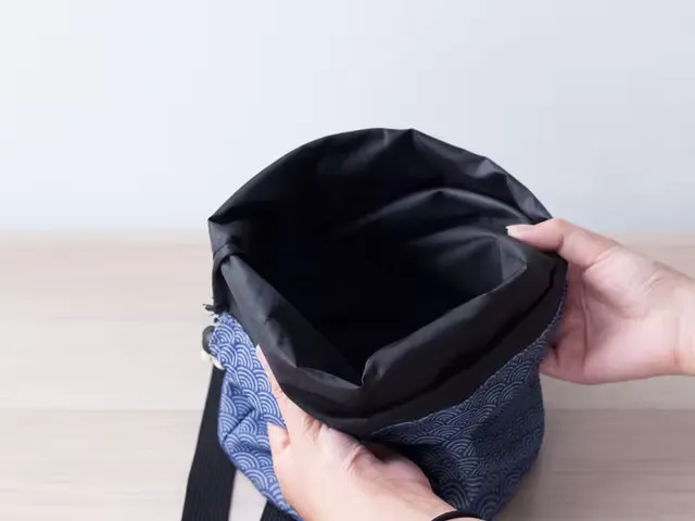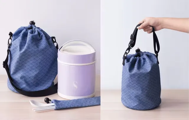 KOKOROフードジャーには、防水性のある巾着バッグと磁器製カトラリーセットを用意しています。巾着バッグのヒモは調節可能で、2通りの使い方ができます。内側は防水素材を使用しているので、お手入れも簡単です。