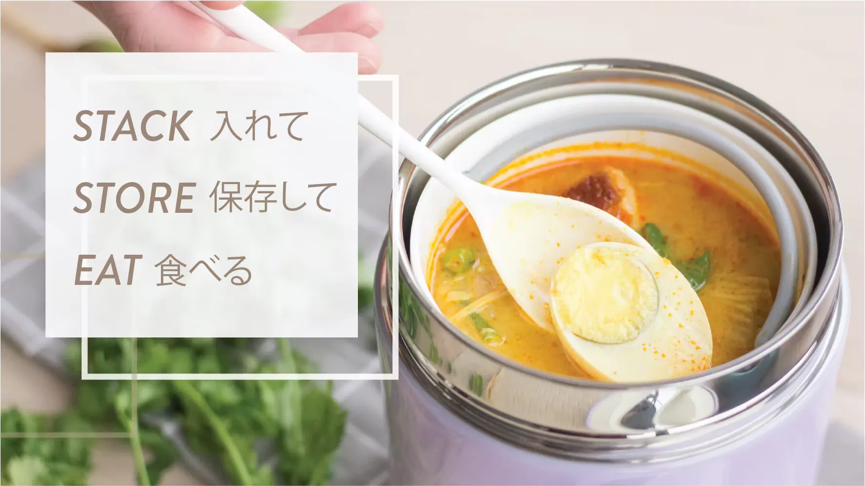 KOKOROフードジャーMサイズは1段(1100ml)もしくは、2段(850ml)重ねることができ、1~2人用です。