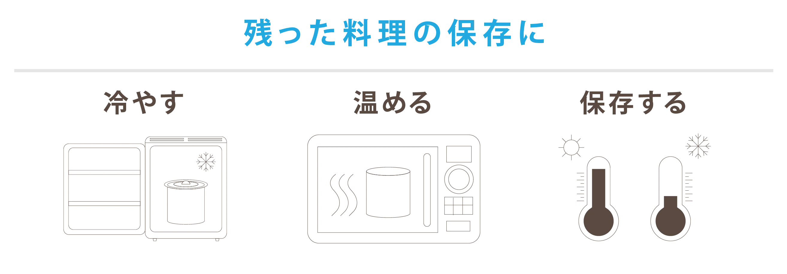 それぞれ磁器容器を分けて、残った料理を冷蔵庫で保存します。衛生面を考慮して、シリコン製の蓋を使用してください。食べる前に再び加熱します。8時間以上、食べ物を保温、保冷することができます。