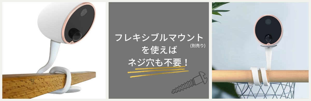 ネジ穴をあけたくない!という場合や、ネジ穴をあけられない場所にカメラを設置したい!という場合はフレキシブルマウント(別売り)を使えば設置が可能です。フレキシブルマウントはソーラーパネルにもお使いいただけます。