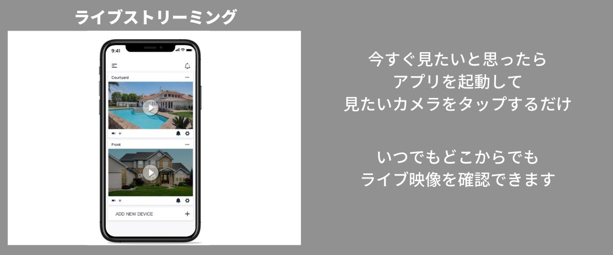 外出中でも気になったらいつでもどこからでもライブストリーミングでカメラの映像を確認することができます。