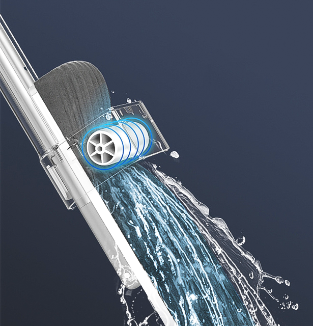 ローラー絞り機を手に持ち、ポールを引っ張るだけで軽い力でもスポンジ内の汚水を絞り出します。