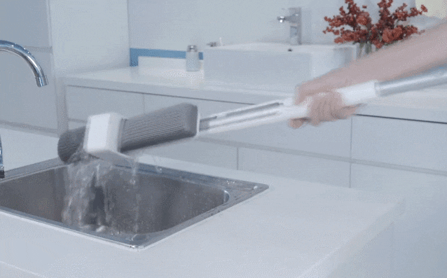 ※スポンジの洗浄は、まず流水で表面のゴミを落とし、ローラー絞り機を手で押さえ、ポールを手前に引いてください。2~3回繰り返すと、良く絞れます。
