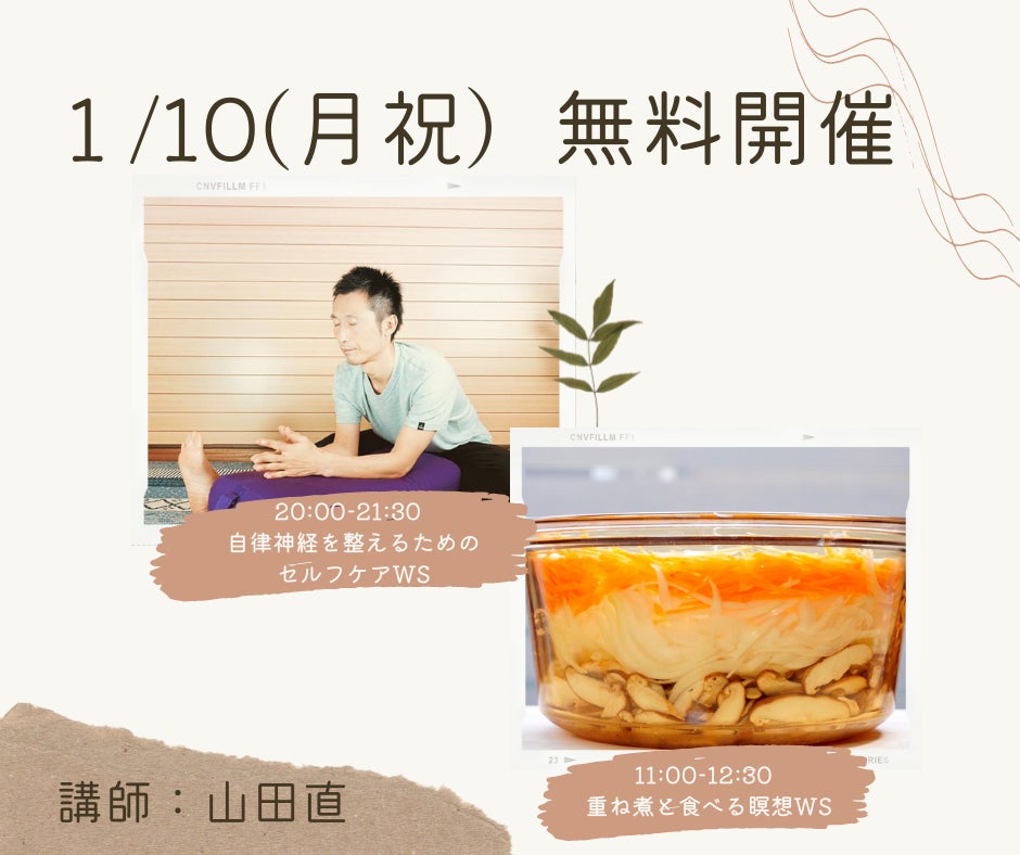また先週から1月31日までの全プログラムの無料期間が始まりました。多数のご参加ありがとうございます。今週からまた新たなプログラムも始まります。以下スケジュールをご確認の上、この無料期間の機会に是非たくさんのプログラムをお試しください。 (表紙写真は明日開催のプログラム、山田直さんによる「重ね煮&食べる瞑想」、「セルフケア」WSです!)